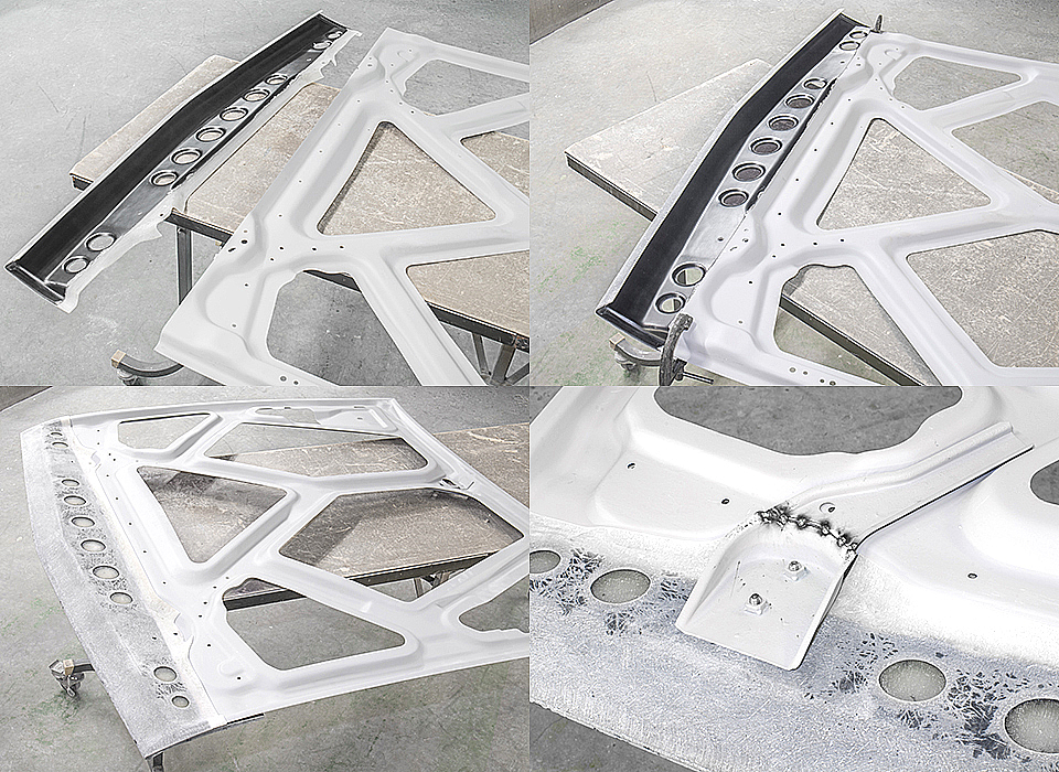 左上がインナーパネル移植部分の全貌です。ブラックのゲールコートが塗布されていないところが接着面になります。右上がカットしたインナーパネルに合わせた状態。左下が内部の様子、このような感じで約5mmほどの厚みがありますので1mm弱の鉄板インナーパネルとは段差がつきます。今回のセリカのボンネットはハコスカのように前側に立ち上げて開くタイプ。ボンネットインナーパネルのヒンジ部はかなりの応力がかかります。今回この強度を考えヒンジ装着部を跨ぐように接着部分の位置決めをした訳ですが、インナーパネル内部にあるヒンジ装着ナット付きの補強プレートがGFRPの厚みの分浮いてしまいます。コストの事を考えるとスペーサーか何かを挟んで接着か溶接するのか悩んだのですが・・・ ここはいつもの『迷ったら攻めろ!』って事でカットして約4mmあるGFRP面、1mm弱の鉄であるインナーパネル面にピッタリフィットするように一度カットして削り、高さを調整しながら溶接しました!後から二度とやり直しができない部分はオーバークオリティーぐらいの心構えが後々結果として現れます!!